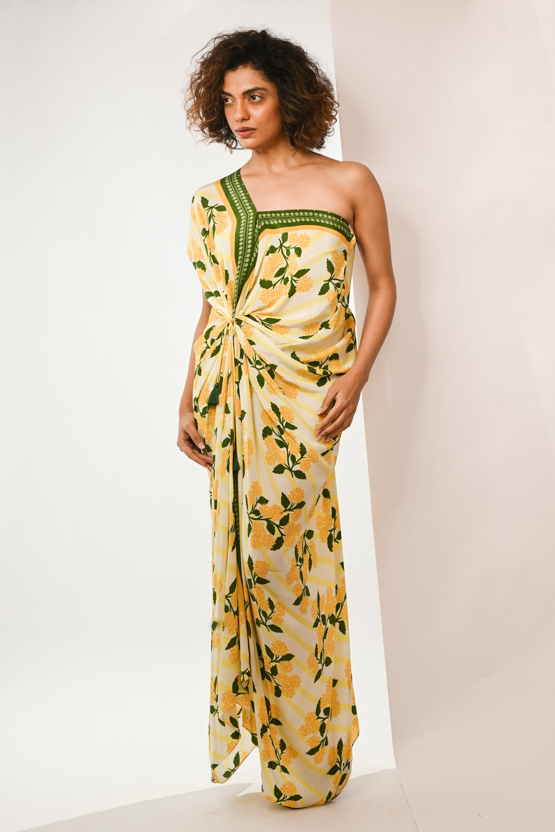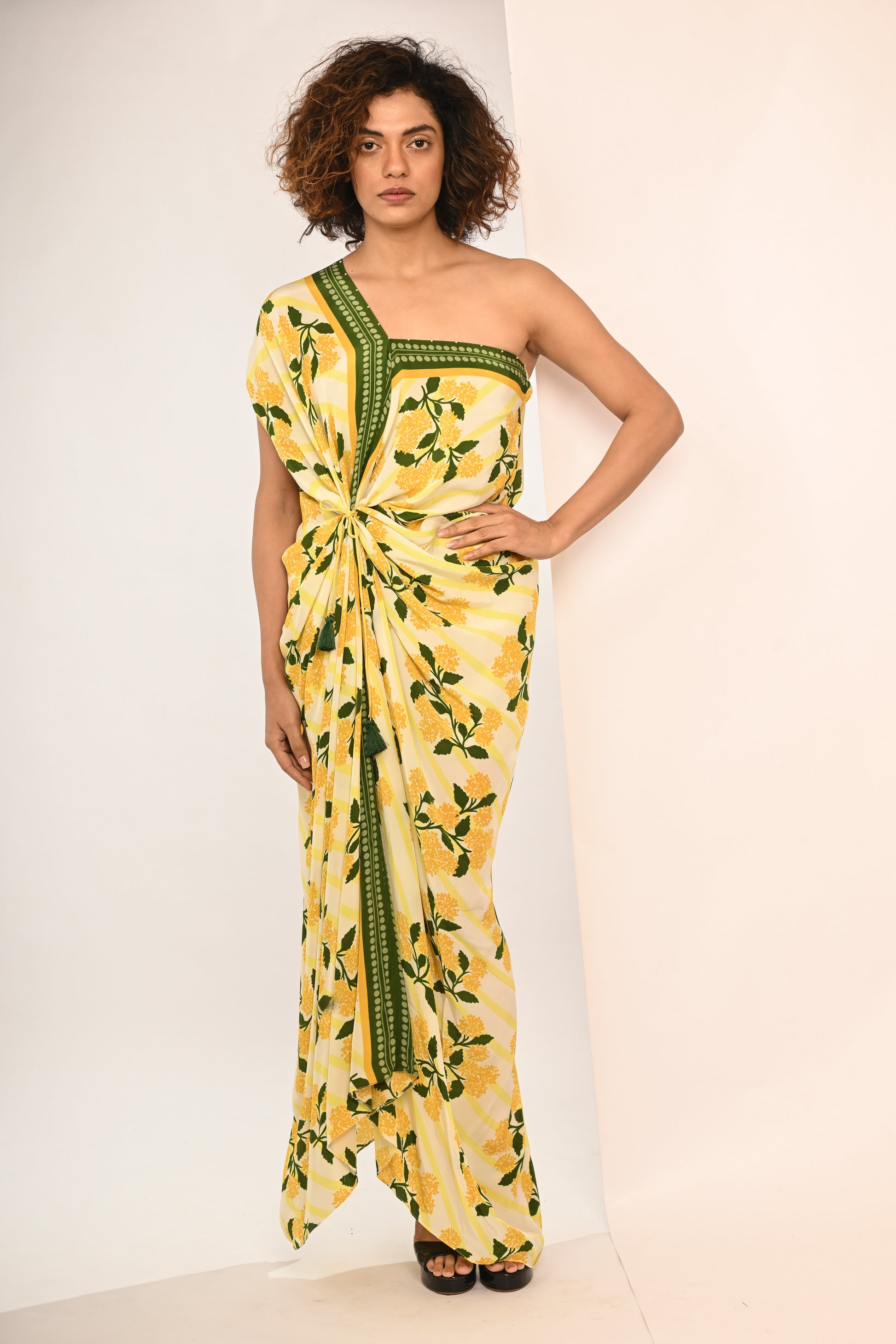 Yellow hygrangea printed draped maxi dress with front tie up