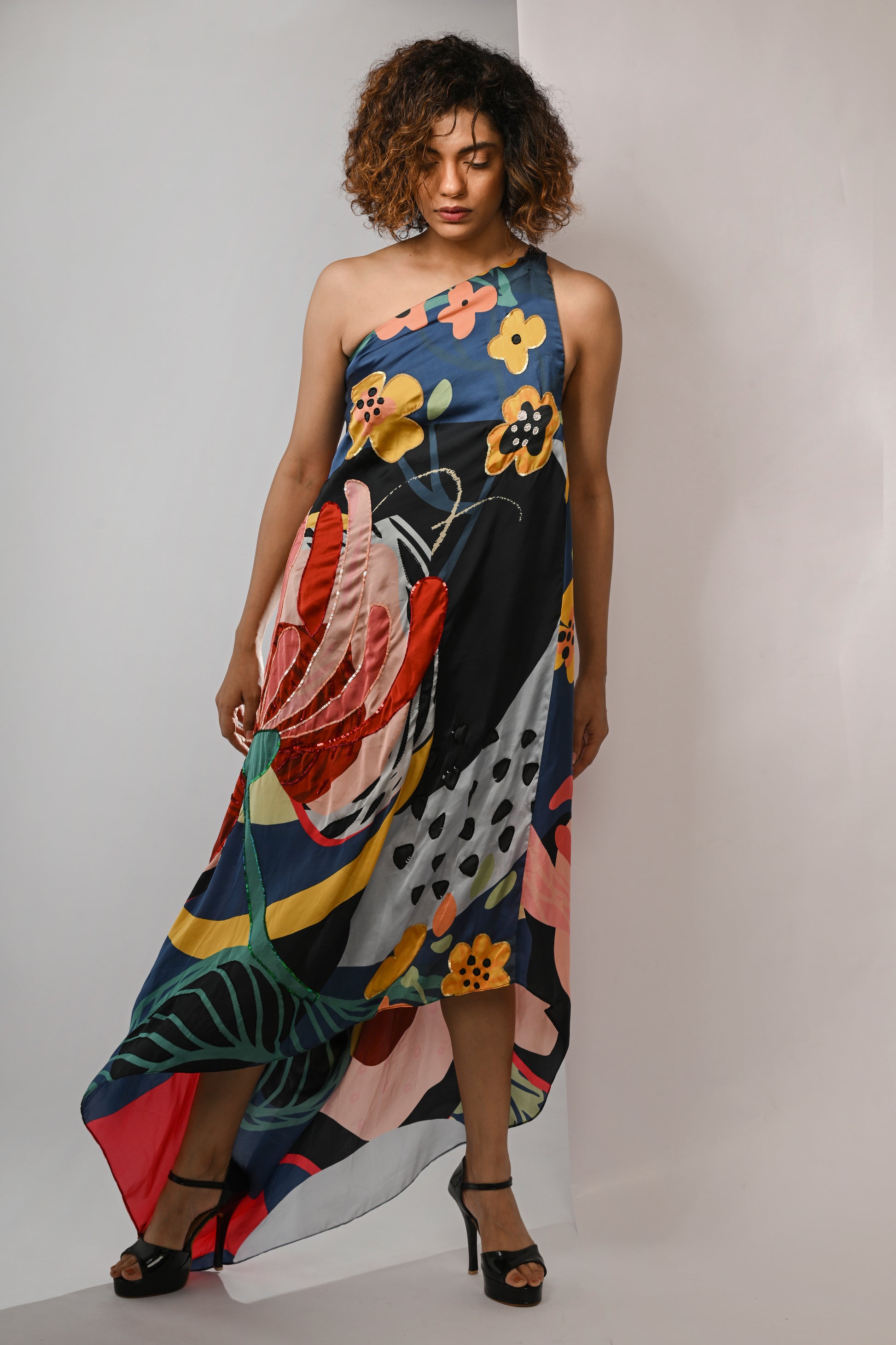 Abstract graphic floral printed hankerchief dress on white base with hand done sequins embroidery details