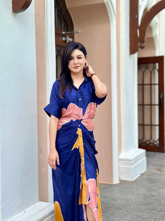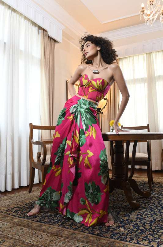 FLOWER PRINTED CORSET AND DRAPED SKIRT