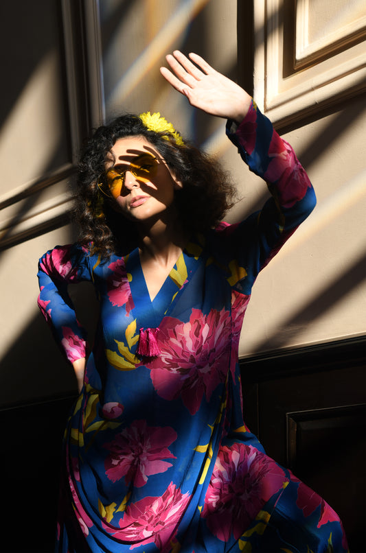 CHRYSANTHEMUM FLOWER PRINTED DRAPED KURTA WITH COORDINATED TROUSER SET