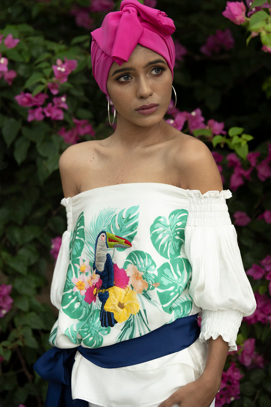 TOUCAN PRINTED EMBROIDERY HIGHLIGHTING OFFSHOULDER TOP WITH LAYERED TROUSERS