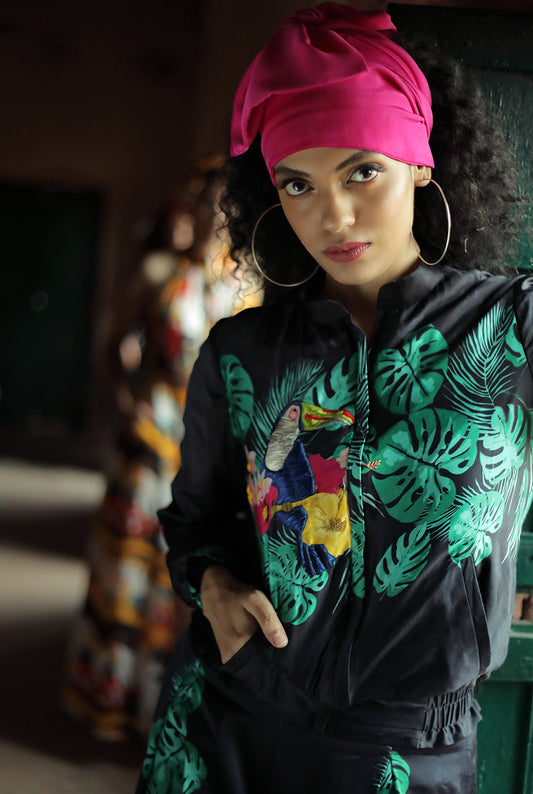 TOUCAN PRINTED BOMBER JACKET WITH EMBROIDERY HIGHLIGHT AND PRINTED TROUSERS