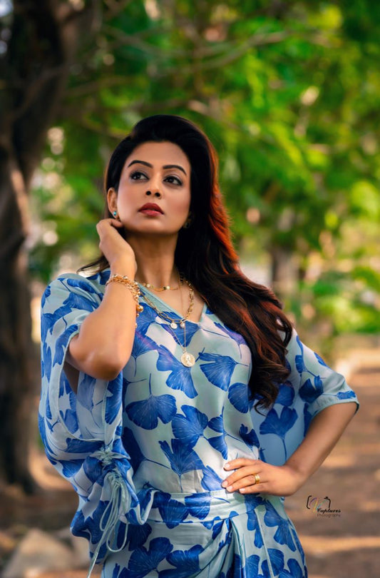 PRIYAMANI IN GINGKO LEAF PRINTED DRAPED SKIRT AND TOP